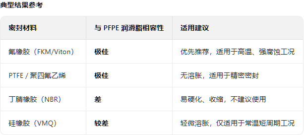 PFPE 潤滑脂與橡膠、塑料的不相容是設備泄漏、密封失效的主要原因,需優先驗證。