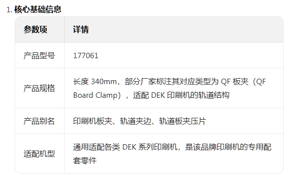 :主要用於 SMT 生產線、PCB 精密印刷等自動化製造領域,適配 DEK 印刷機的各類印刷流程,是保障印刷作業順暢、提升生產效率和產品良率的重要配件。
